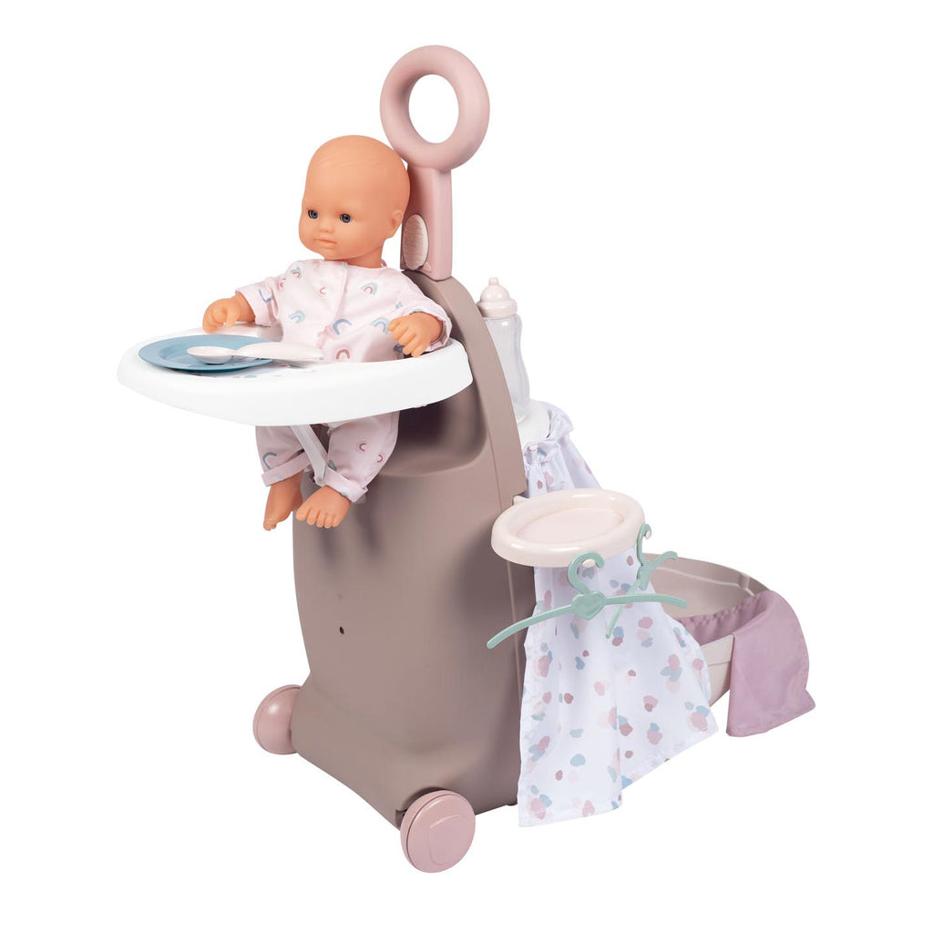 Smoby verzorgingstrolley voor poppen. Deze 3in1 trolley is zowel een koffer als een babystoel als een wiegje. Geschikt voor poppen tot 42 centimeter groot. Inclusief 6 accessoires: 2 kleerhangers, bord, lepel, babyflesje en een dekentje. De verzorgingstrolley is 25,5 bij 25,5 bij 62 centimeter groot. Geschikt voor kinderen vanaf 18 maanden oud.