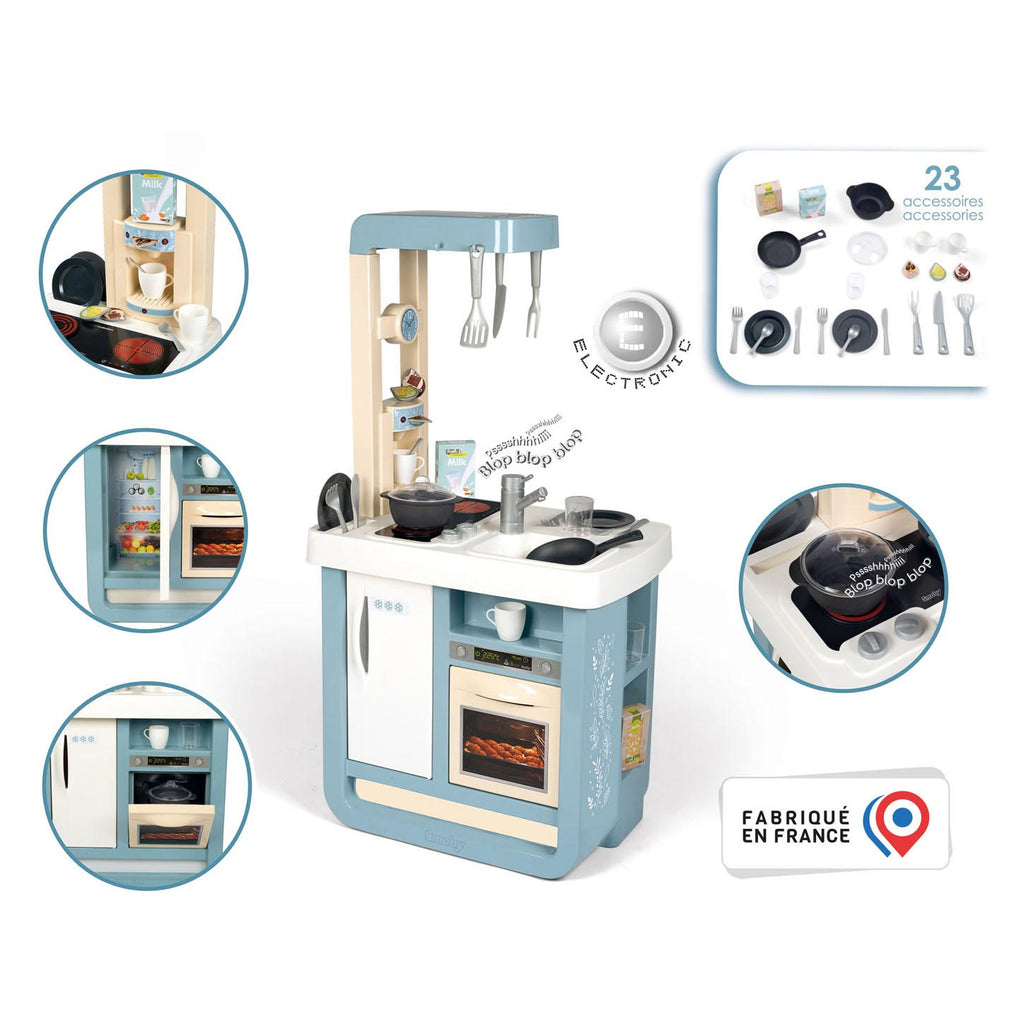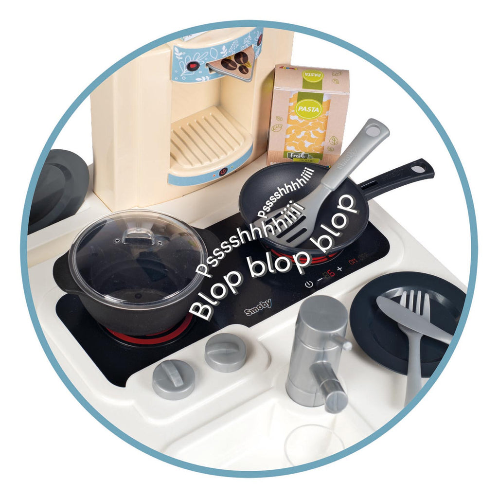 Smoby keuken met een mogelijke mogelijkheden, waaronder echte kookgeluiden. De keuken bevat een oven, koelkast, gootsteen en een espressomachine. Inclusief 23 accessoires, zoals pannen, kopjes, borden en bestek. De afmetingen van de keuken zijn 52,1 bij 32,5 bij 95,7 centimeter. De hoogte van het aanrechtblad is 48,5 centimeter. Geschikt voor kinderen vanaf 3 jaar oud.