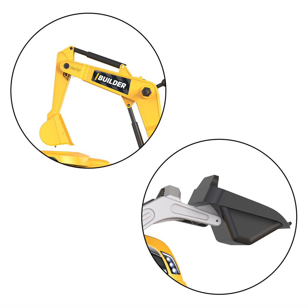 Geel met zwarte tractor met pedalen, shovel laadbak, graafmachine en aanhanger. • Afmetingen inclusief aanhanger: 182 bij 44 bij 66 centimeter. Zithoogte 39 centimeter. • Geschikt voor kinderen vanaf 3 jaar oud. • Gemaakt in Frankrijk.
