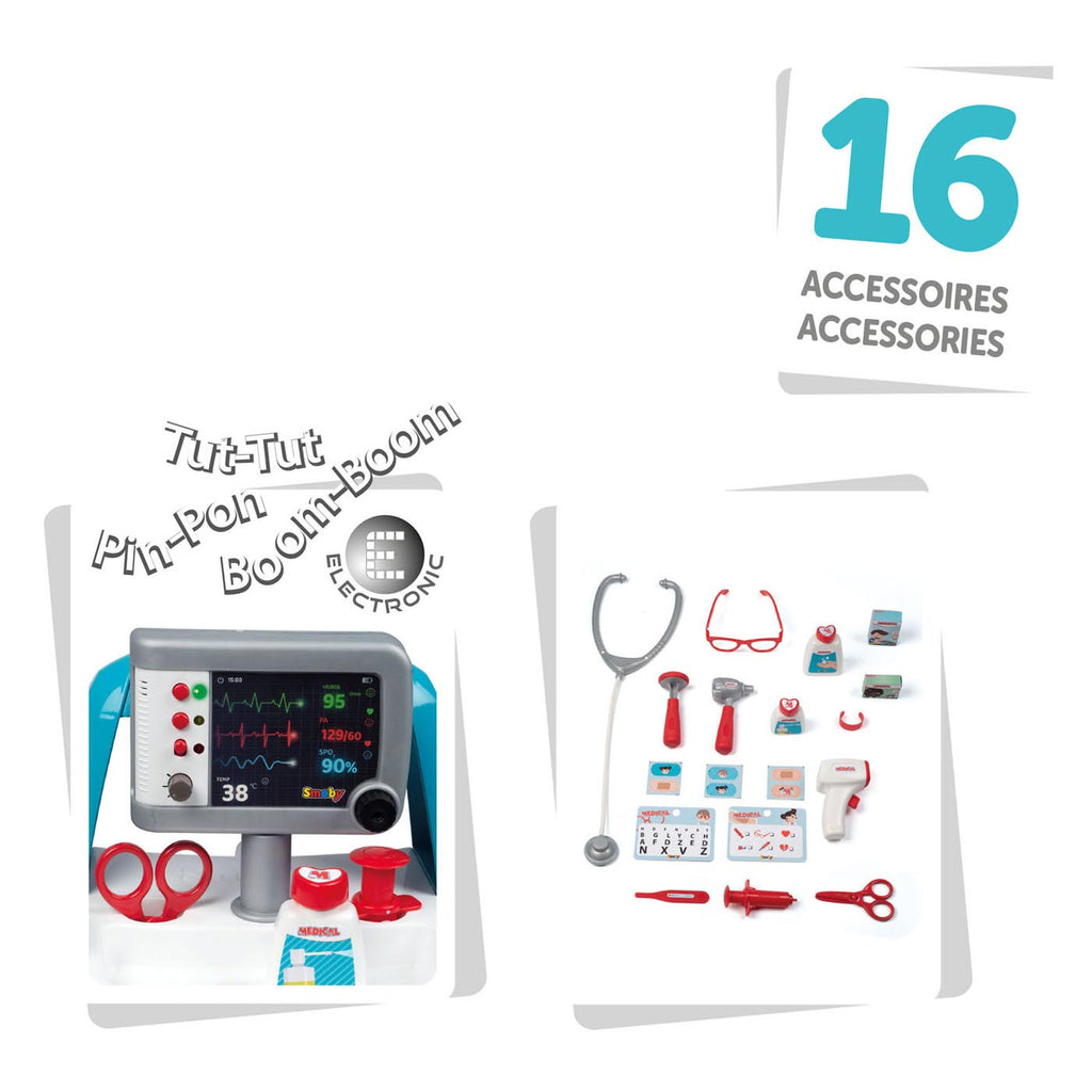 Dokterstrolley van Smoby met 16 accessoires voor het spelen van doktertje. De trolley werkt op batterijen (2 LR6, niet inbegrepen) en heeft licht en geluid. De hartmonitor op de trolley laat verschillende medische gegevens zien, waaronder de hartslag, bloeddruk, zuurstofsaturatie en temperatuur. Afmetingen: 31 x 32 x 55 centimeter. Geschikt voor kinderen vanaf 3 jaar oud.