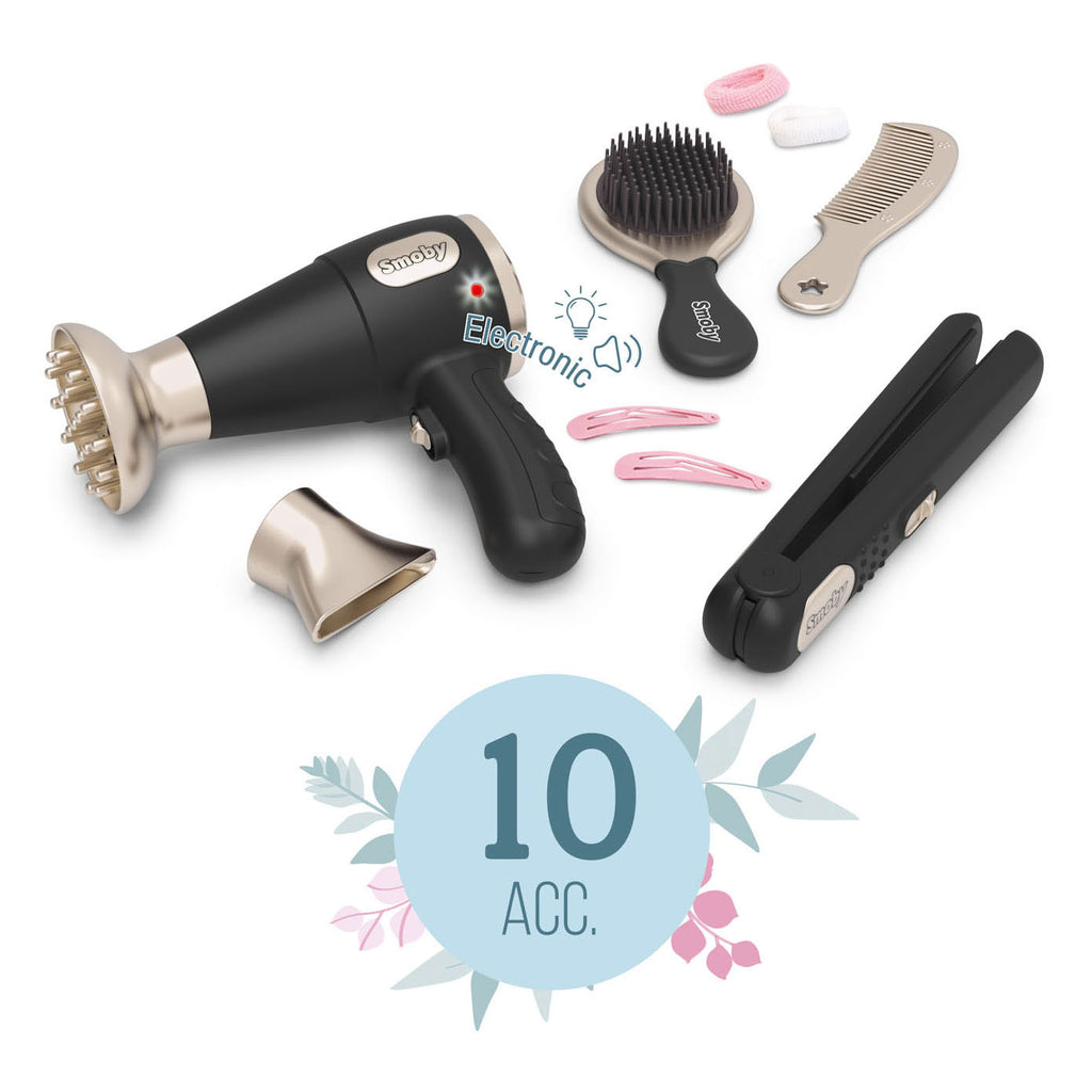 10-delige speelset van Smoby My Beauty. Deze set bevat verschillende haaraccessoires voor realistische rollenspellen. De moeite waard werkt op 2 AAA-/LR03-batterijen, deze zijn niet inbegrepen. De haarset is gemaakt van kunststof in stijlvol zwart en parelmoer beige. Voor kinderen van 3 jaar en ouder.