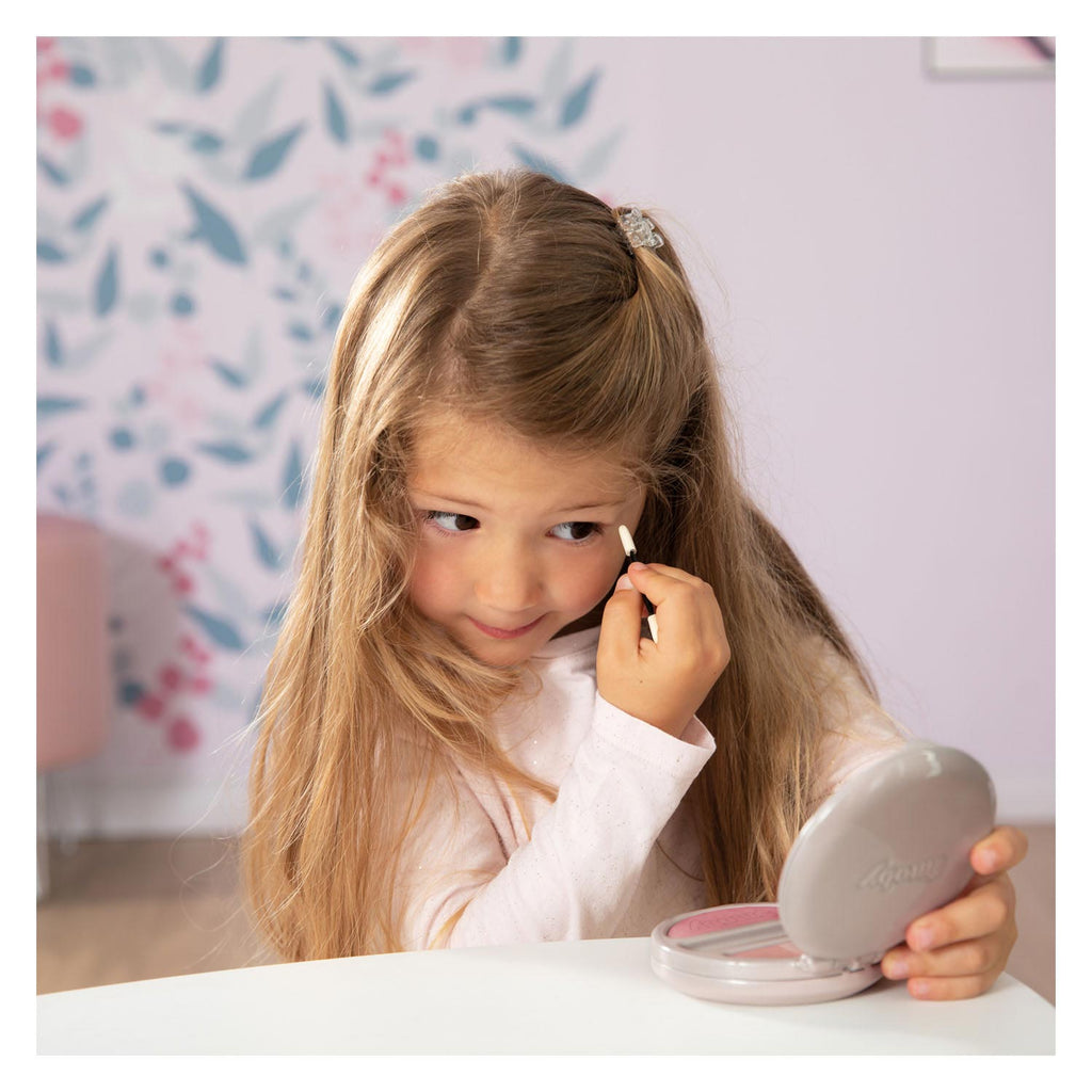 Speelgoed poederdoos van Smoby My Beauty, met spiegel en ingebouwd licht. Inclusief één kwastje en vier kleuren neppoeder. Werkt op 2 AAA-batterijen (niet inbegrepen) en geschikt voor kinderen vanaf 3 jaar.