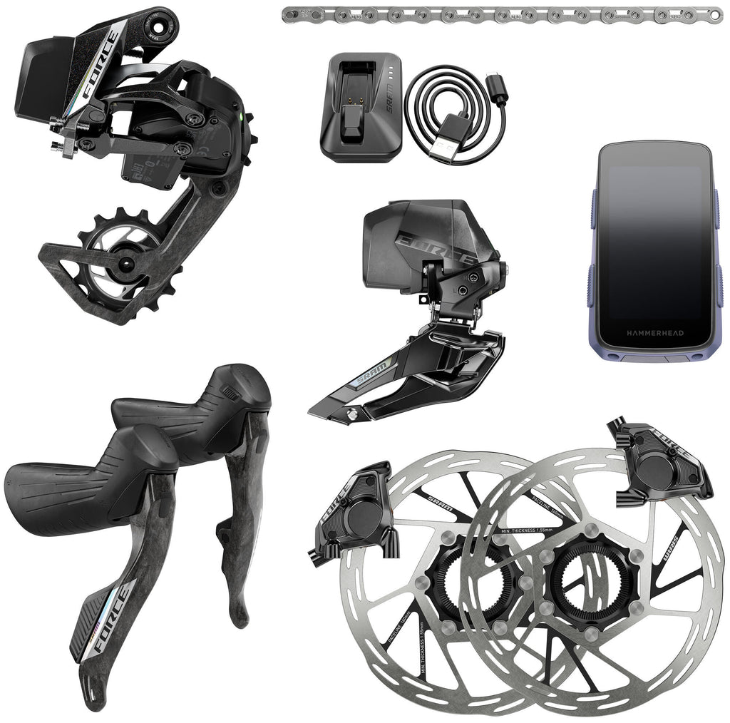 Bestaande uit: Achterderailleur (max. 36 tanden), schakel-/remhendels, schakel-/remhendel, voorderailleur voor braze-ons, hydraulische schijfremmen met vlakke opname, twee Paceline remschijven Ø 160 mm, centraalslot, Accu's, Force ketting met 114 schakels. Diameter remschijf 160 mm Hoofdkleur zwart Inzetbereik road Type/soort Artikel