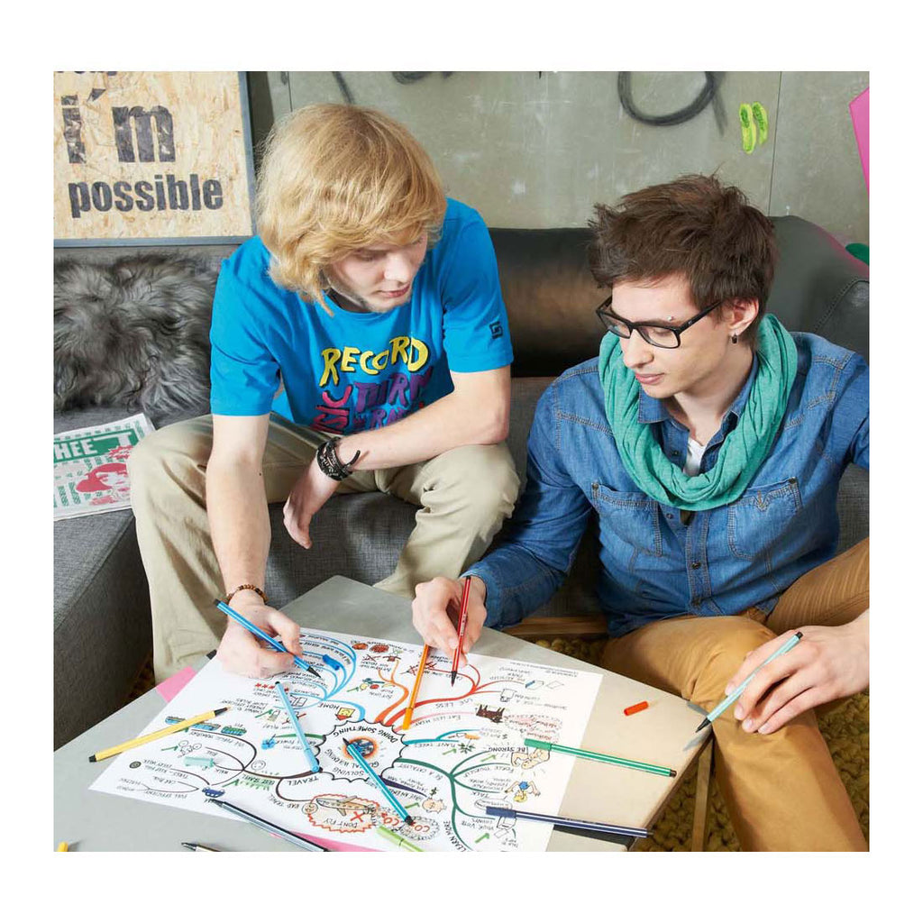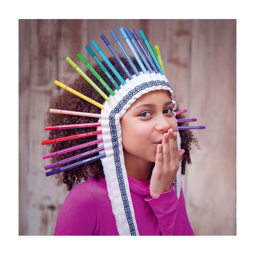De STABILO Pen 68 viltstiften zijn viltstiften van de allerhoogste kwaliteit en bieden oneindig veel kleurmogelijkheden. De punt is 1 mm dik voor krachtige lijnen en de kleuren van vlakken. Het robuuste punt zorgt voor een regelmatige inktafgifte. De viltstift kan 24 uur zonder dop zonder dat de punt uitdroogt. De kleuren zijn intens en zeer goed dekkend. De inkt is op waterbasis en geurloos. Alle kleuren zijn te mengen met water, waardoor er prachtige aquareleffecten en terugkerende kleurverlopen mee kunnen worden gemaakt. Voor het mooiste aquarelresultaat breng je de gewenste kleur aan op een stukje folie of een schoteltje en vervolgens pak je de kleur op met een nat kwastje. Bij gebruik met water is het aan te raden om papier of karton te gebruiken. Alle kleuren kunnen met elkaar gemengd worden, waardoor elke willekeurige kleur kan worden gemaakt. Door regelmatig met een vochtig wattenstaafje over de grote oppervlakken te lastig mooie ontstaan, opvallende kleurovergangen. De kwaliteit van het papier bepaalt ook de kwaliteit van het mengen met water.