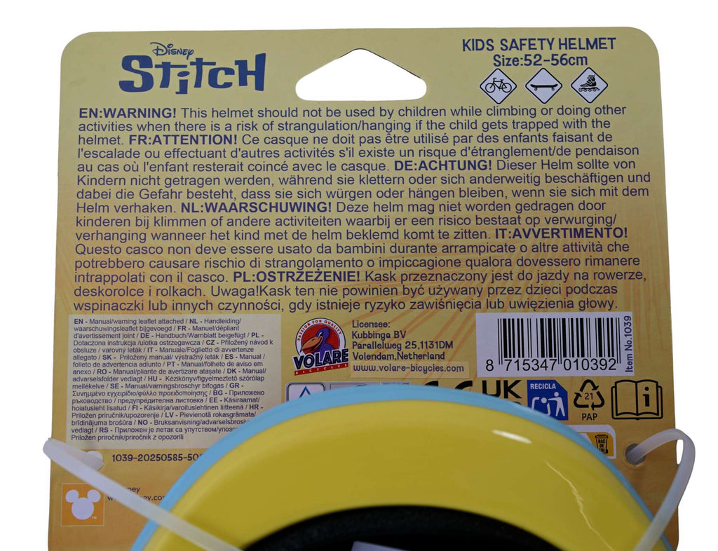 Volare Kinderfietsen beschikt over een grote collectie licentie helmen. Een daarvan is deze prachtige Disney Stitch fietshelm. De mooie roze kleur en de Stitch decoraties geven de helm een perfecte uitstraling. Met de draaiknop is de hoofdomtrek van de helm verstelbaar van 52 tot 56 cm. Daarbij is de onderkant van de helm ook bedekt. De helm weegt slechts 200 gram. Dat maakt hem extra licht en dus makkelijk te dragen. De helm is naar de strengste eisen van het TÜV/GS goedgekeurd.