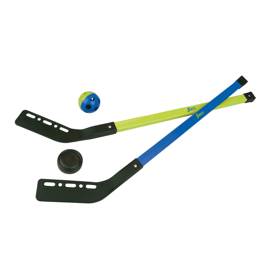 Straathockeyset met twee sticks, een bal en een puck. De kunststof stok is 77,5 centimeter lang. De puck en straatbal hebben een doorsnede van 6 centimeter.