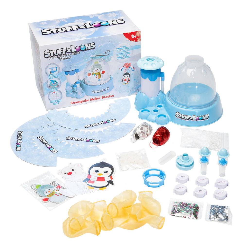 Stuff-A-Loons is de geweldige en innovatieve manier om je eigen gevulde ballon te maken! Maak nu je eigen winterwonderland met de Snowglobe Maker Station! Creëer een gevulde ballon voor jezelf of voor een ander. Gebruik de Maker Station om de ballon te vullen met wat jij maar wilt. Blaas de ballon dan op, sluit hem af van een versier de ballon. Creëer een Stuff-A-Loons ballon voor de feestdagen! Naast het Maker Station zijn er ook verschillende navullingen beschikbaar. Vier de wereld �?? met speciaal ballonnen ballonnen. Inhoud: Maker Station 1x Handleiding 12x Transparante ballonnen 6x Herbruikbare clips 2x Glitter 1x Confetti 2x Gekruld Lint 4x Thema Standaarden 2x Winterthema full color boekene kaarten 1x Viltstof deco sneeuwpop 1x Polystyreen bolletjes