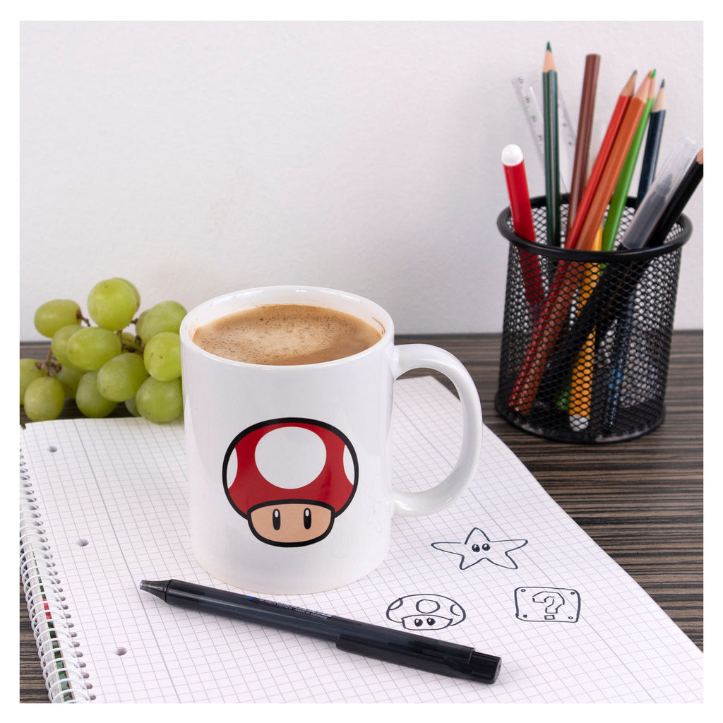 Een leuke mok van Super Mario met een afbeelding van een Super Mushroom (paddenstoel). Deze mok heeft een grootte van 9,5 x 8 centimeter en een inhoud van 325 ml.