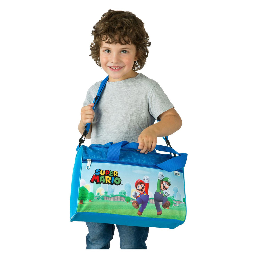Super Mario sporttas met verstelbare schouderband, twee handgrepen, een groot hoofdvak en voorvak met verbrand. 35 x 23 centimeter groot.