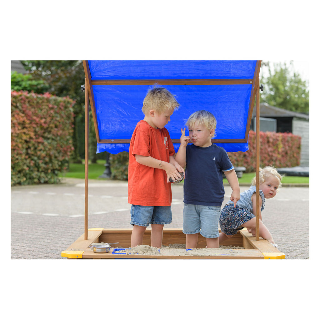 Houten zandbak van 120x120 centimeter groot met afdakje van zeil dat te gebruiken is tegen de zon en als gunstig van de zandbak. In de rand van de zandbak zijn twee kunststof verwerkte bakken, die gebruikt kunnen worden voor water of zandbakspeelgoed. De zandbak is gemaakt van duurzaam en geïmpregneerd FSC®-gecertificeerd hout en heeft een maximale hoogte van ca. 120 centimeter.