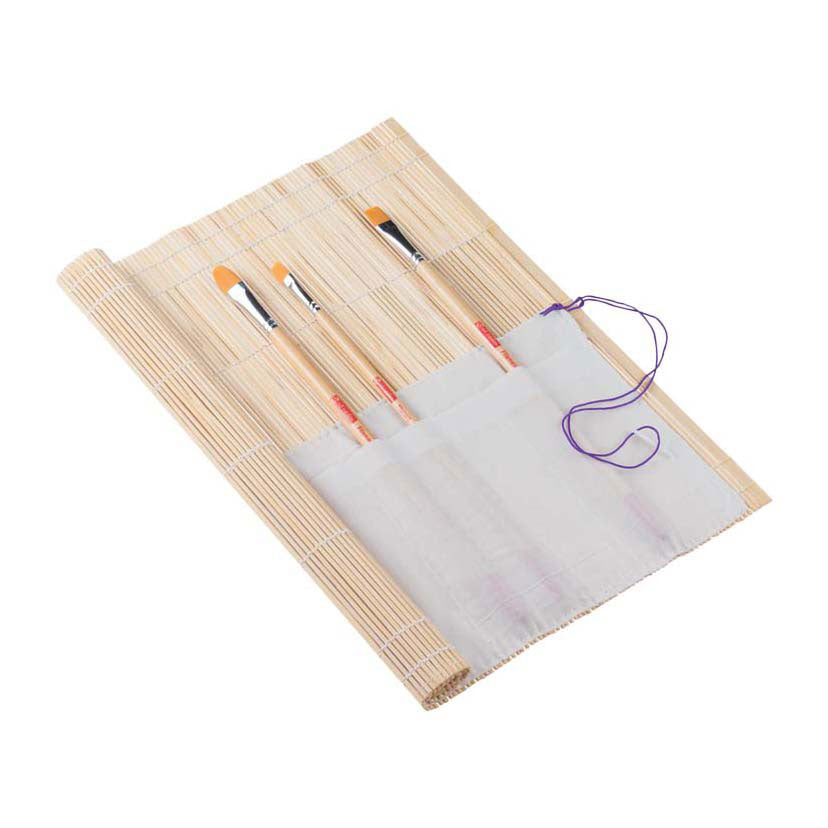 Een duurzame manier om mee te nemen. Steek de penselen in de klemmen, rol de mat op en sluit de mat met het koord. Zo zijn de haarbundels beschermd tegen beschadiging en kunnen natte penselen drogen vanwege de mat verntileert. Penselen niet inbegrepen. Afmetingen: 360x350 mm.