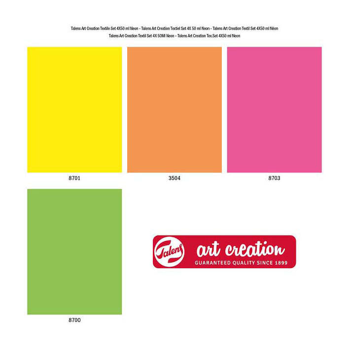 Upcycle kleding, accessoires of woondecoraties zoals kussenslopen, gordijnen en andere voorwerpen van textiel met Talens Art Creation Textiel verf! Deze set bevat 4 stralende neontinten van Textiel verf voor lichtgekleurde stoffen (minstens 50% katoen). Veel plezier met het maken van je eigen ontwerpen op textiel!