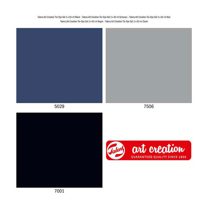 Voeg een beetje kleur toe aan je kleding, accessoires en interieur met tie-dye! Tie-dye is een goedkope en leuke manier om je effen kleding en andere voorwerpen van textiel te upcyclen en ze om te toveren in je nieuwe favoriete spullen! Creëer leuke, kleurrijke patronen zoals spiralen, starbursts, ombré's en meer door de stof te verdraaien en vast te binden met elastieken of klemmen en verschillende kleuren verf toe te voegen. Deze tie-dye set bevat drie flacons met Talens Art Creation Silk verf, een verf op waterbasis die ideaal is om lichtgekleurde natuurlijke stoffen te verven. De gemakkelijke kleuren zijn klaar om te gebruiken en verpakt in flacons met fijne dosisuitjes waarmee je de verf egaal en precies aan kunt brengen op de stof. De set bevat ook een paar wegwerphandschoenen om vlekken op je handen te voorkomen. Inhoud: 3 x 85 ml (5029 Indigoblauw - 7506 Neutraal Grijs - 7001 Elegant Zwart), handschoenen. Gebruiksaanwijzing: Was de stof zonder wasverzachter voordat je begint voor het beste resultaat. De stof natmaken helpt om de verf beter te laten vloeien. Bedek je werkplek met plastic om het oppervlak te beschermen. Draai en bind de stof van met elastieken of klemmen. Doe de handschoenen aan voordat je begint met verven. Breng de verf direct op de stof aan met de dosisuitjes. Vergeet de achterkant niet! Voor nog intensere kleuren kun je de verf 24 uur in laten trekken voordat je de stof fixeert en weggooit. Voor lichtere kleuren kun je de stof uitspoelen onder de kraan voor het fixeren. Fixeer de kleuren met een strijkijzer op een hoge stand voor 5 minuten met beschermend papier (zoals bakpapier) tussen de stof en het strijkijzer. Na het fixeren kun je het voorwerp op 40 °C wassen en is het geschikt voor de droger. Was het onderwerp de eerste keer apart in koud water om te voorkomen dat de kleuren overlopen. Laat het voorwerp volledig drogen en geniet van je nieuwe persoonlijke ontwerp!