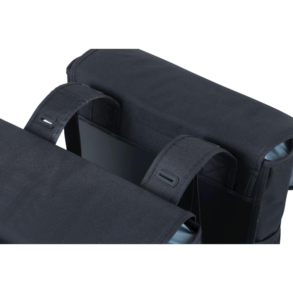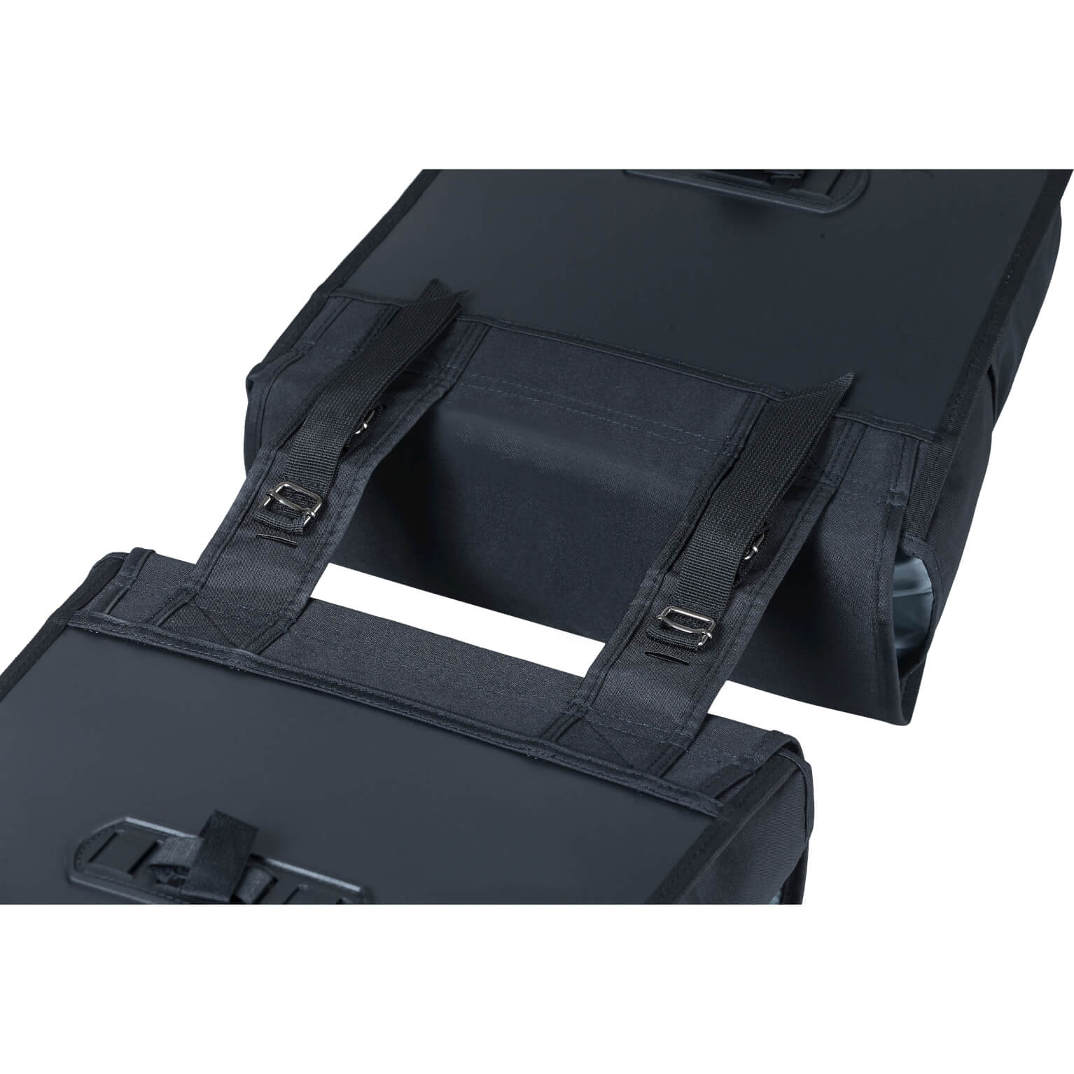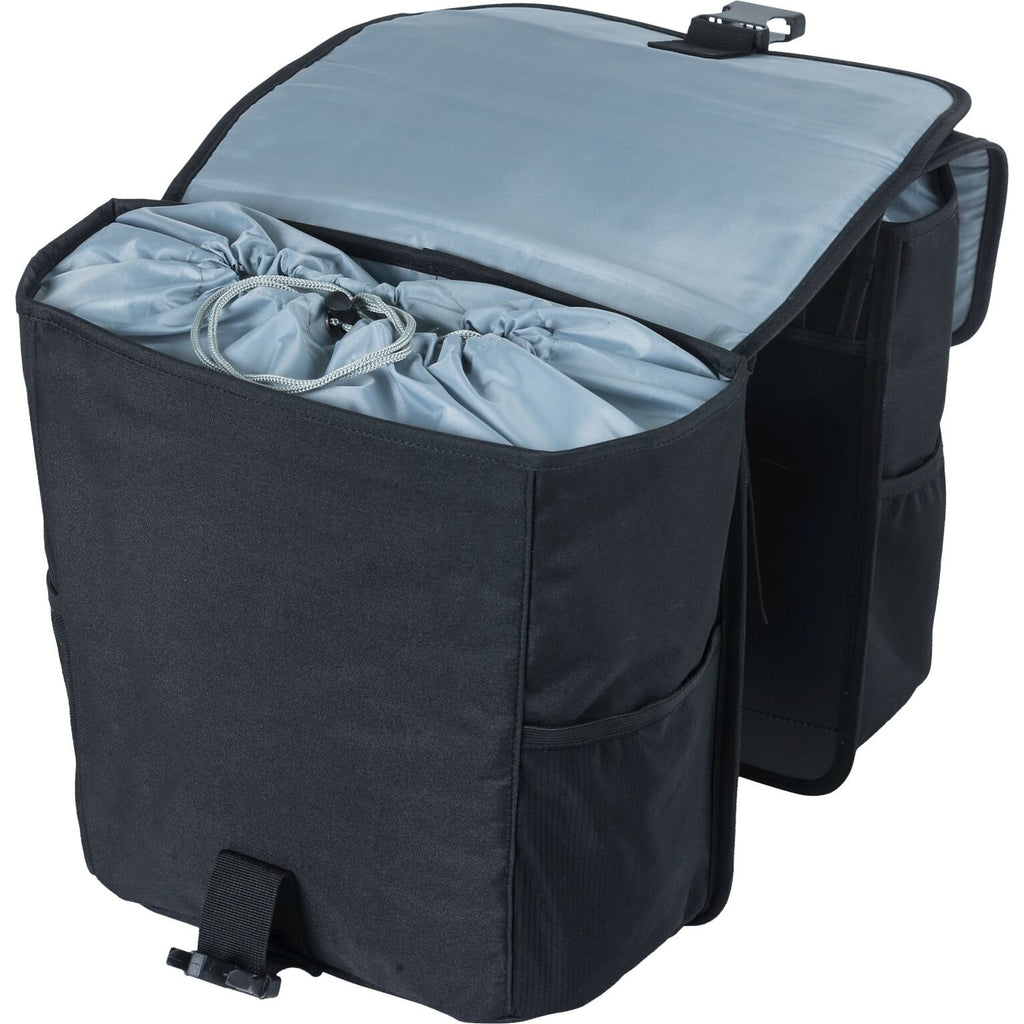 De Basil GO Double Bag is een zwarte dubbele fietstas voor achterop, perfect voor mensen die veel onderweg zijn met de fiets. Of je nu naar de supermarkt gaat of een fietstochtje maakt naar een vriend, deze moderne fietstas maakt jouw fietsrit gemakkelijker en leuker. De tas is afsluitbaar met aansnoerkoord en kliksluiting. Er zijn twee verstelbare banden aanwezig waardoor er ruimte is voor snelbinders, een kinderzitje, veerklem of bagagedrager. De elastische zijvakken bieden ruimte voor een flesje water of (waneer nodig) een paraplu. De stevige tas is gemaakt van hoogwaardig materiaal en heeft een inhoud van maar liefst 32 liter. Zo heb je genoeg ruimte voor boodschappen, sportkleding of andere benodigdheden. De reflectiedetails zorgen ervoor dat je beter zichtbaar bent in het donker. De Basil GO Double Bag is ook verkrijgbaar in het denim blauw. Productspecificaties - Afmetingen: 33 x 16 x 38 cm (Buitenwerkse maten) - Volume: 32 l - Model: Achtertas - Dubbel of enkel: Dubbel - Geschikt voor: Elektrische fiets, stadsfiets, city-trekking fiets