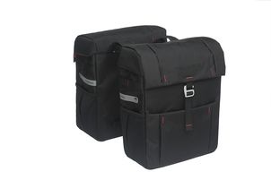 De zwarte Vigo Double is een stevige dubbele fietstas met een sportieve uitstraling. Met een handig formaat is deze moderne tas perfect voor dagelijks gebruik. De fietstas past op vrijwel alle fietsen, ook elektrische. Het hoofdvak van de tas sluit je met een aansnoersluiting en vervolgens sluit je de klep eenvoudig met een moderne haaksluiting. Dankzij het ruime hoofdvak, een extra voorvak en elastische zijvak, neem je spullen goed georganiseerd mee. De tas is gemaakt van waterafstotend polyester en heeft reflecterende logo's voor extra zichtbaarheid tijdens het fietsen. Productspecificaties - Kleur: zwart - Kleurnaam: zwart - Materiaal: polyester - Afmetingen: 31 x 15 x 40 cm - Montage: riempjes - Type tas: dubbele achtertas