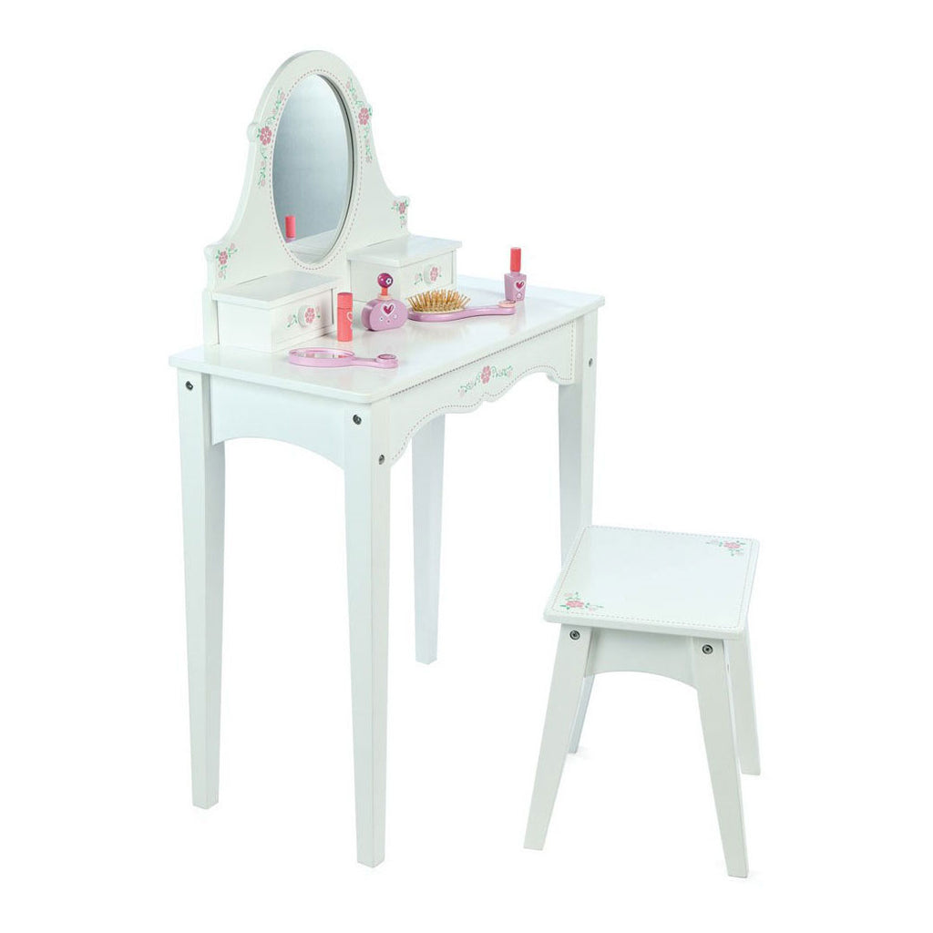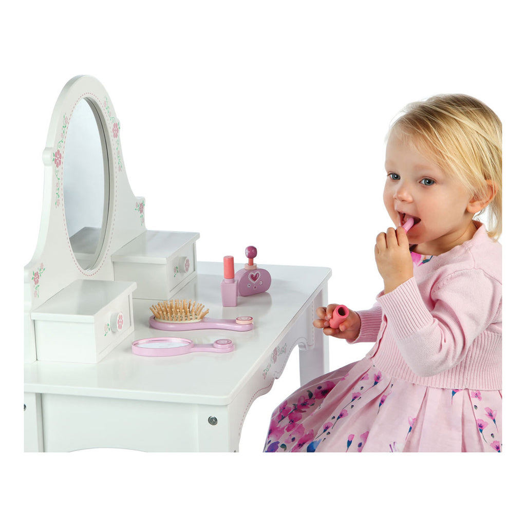 Kaptafelset bestaat met kinderkaptafel, kinderkrukje, houten make-up, borstel, spiegel: - Afmetingen kaptafel: 30 x 95 x 58,5 cm. - Hoogte kruk: 33,5 cm. - Geschikt voor 3 jaar en ouder.
