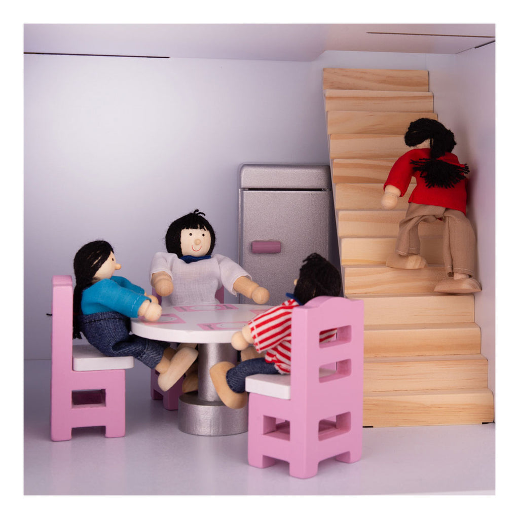Houten poppenkeuken: - Bestaat uit: poppenkoelkast/-vriezer, poppentafel en vier poppenstoelen, twee voedselaccessoires en een poppenkeuken met een wasbak en een fornuis. - Gemaakt van hoogwaardige, verantwoorde materialen. - Voldoet aan de huidige Europese veiligheidsnormen. - 9-delige houten poppenhuismeubelset. - Langs bij de meeste houten poppenhuizen. - Afmetingen: 15cm L x 16cm H x 10cm B. - Geschikt voor 3 jaar en ouder.