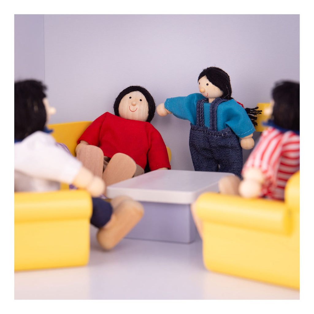 Poppen woonkamerset voor houten poppenhuis: - Bestaat uit: poppenbankstel, poppenfauteuils, tv-meubel met tv en lamp, poppensalontafel. - Gemaakt van hoogwaardige, verantwoorde materialen. - Voldoet aan de huidige Europese veiligheidsnormen. - 9-delige houten poppenhuismeubelset. - Langs bij de meeste houten poppenhuizen. - Afmetingen: 15 cm L x 10 cm H x 10 cm B. - Geschikt voor 3 jaar en ouder.