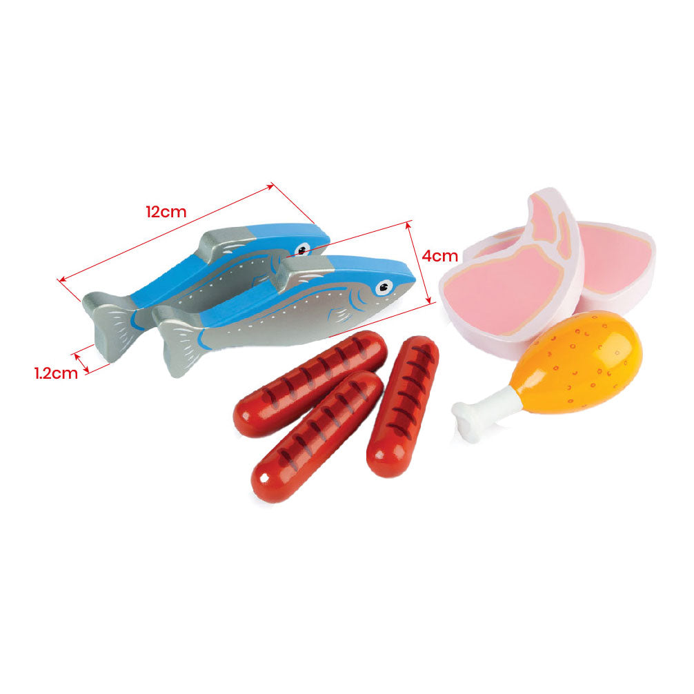 Een leuke vis- en vleesspeelgoedset voor kinderen vanaf 3 jaar oud. Deze set bevat twee vissen, twee karbonades, 3 worstjes en een kippendrumstick. Kinderen kunnen hun eigen speelkeukenavonturen beleven en hun fantasie gebruiken. Het speelgoed is veilig en geschikt voor urenlang speelplezier.