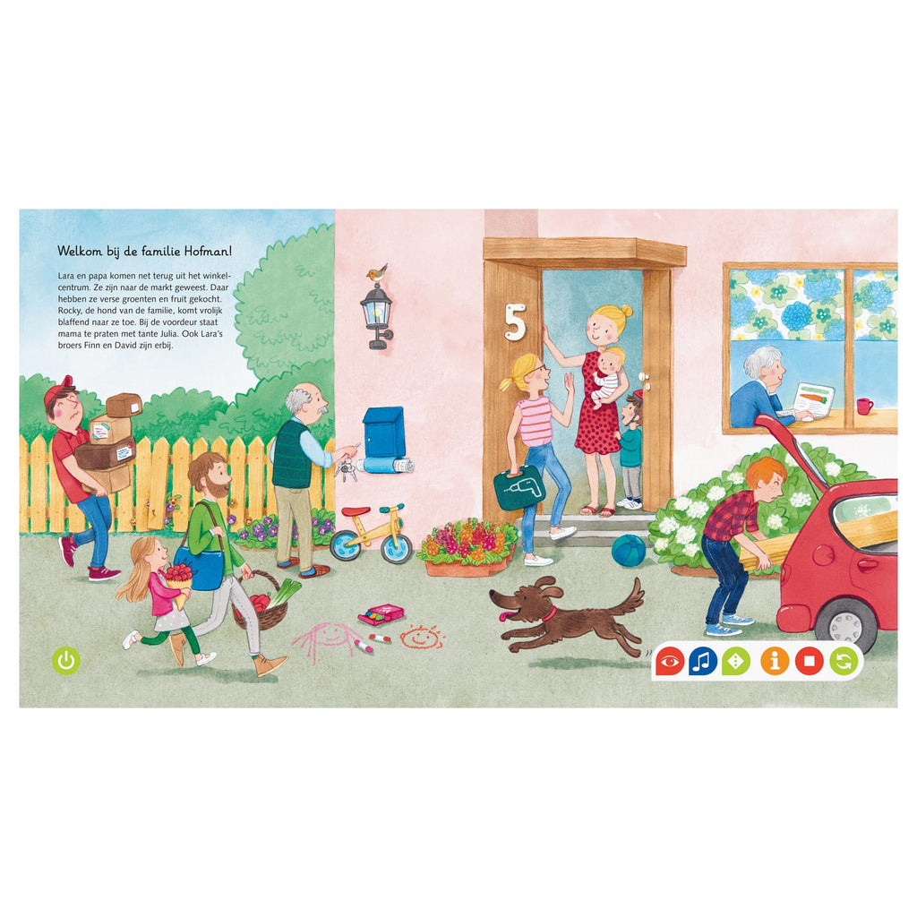 Bij de familie Hofman in de Fonteinstraat gebeurt altijd van alles! Hier wonen de kinderen Lara, David en Baby Finn met hun ouders, opa en oma en de hond Rocky. Met Tiptoi komt het huis van de familie Hofman tot leven. Kinderen verbreden spelenderwijs hun woordenschat en kennis maken met de eerste grammaticale structuren. Tiptoi stift niet niet opgenomen, apart verkrijgbaar.