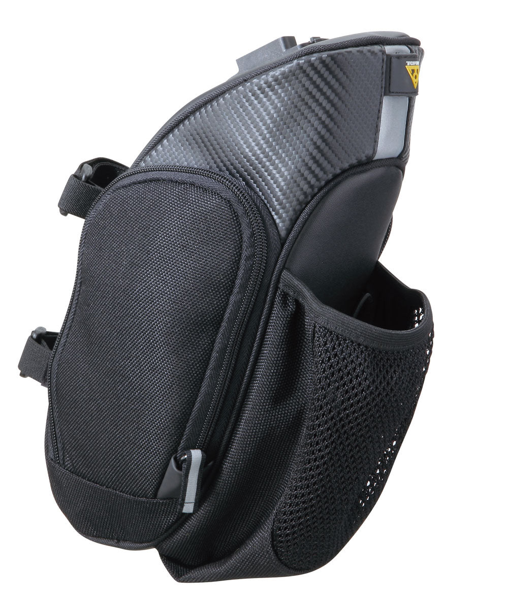 De Topeak MondoPack Hydro zadeltas is een oversized zadeltas die je in staat stelt om comfortabel extra spullen te vervoeren. Met een afmeting van 30 bij 20 centimeter en een inhoud van 1,7 liter biedt dit zadel voldoende ruimte voor al je benodigdheden. De twee zijpanelen kunnen eenvoudig worden geopend, waardoor je gemakkelijk toegang hebt tot al je spullen. Bovendien zijn de zijpanelen voorzien van binnenvakken van mesh, waarin je items zoals sleutels en klein gereedschap veilig kunt opbergen. De zadeltas is gemaakt van duurzaam nylon en is waterdicht, waardoor je spullen veilig blijven, zelfs bij slecht weer. Daarnaast heeft de zadeltas een extra vak waarin je een bidon kunt meenemen of je lichtgewicht jas kunt opbergen. Met de Topeak MondoPack Hydro zadeltas ben je altijd goed voorbereid op elke fietsrit. Productspecificaties - Kleur: Zwart - Merk: Topeak - Primaire basiskleur: Zwart - Type: Mondo - Inclusief regenhoes: Nee - Breedte in cm: 20 - Hoogte in cm: 30 - Materiaal tas: Nylon - Tas-mand bevestigingssysteem: Afneembaar - Diepte: 13 - Inhoud in liter: 1,7 - Accessoire bevestigingssysteem: Afneembaar - Diameter van de zadelpen: 25,4 mm tot 34,9 mm - Extra functies: Bevestiging van 25, flessenhouder, zijopeningselementen, veiligheidslichtclip - Minimale afstand: 24 cm