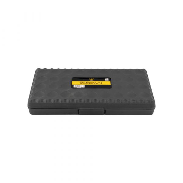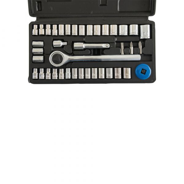 Doppendoos 1/4"+3/8" 40-delig 40-delige doppenset. 18 doppen met inch maten (5/32”- 5/8”): 5/32, 3/16, 7/32, 1/4, 9/32, 5/16, 11/32, 3/8, 13/32, 7/16, 15/32, 1/2, 17/32, 9/16, 5/3, 1/4, 5/16, 3/8 14 doppen met metrische maten (4 mm. – 13 mm.): 4 mm, 4,5 mm, 5 mm, 5,5 mm, 6 mm, 6,5 mm, 7 mm, 7,5 mm, 8 mm, 9 mm, 10 mm, 11 mm, 12 mm. nl 13 mm. Inclusief ratel en diverse hulp en verloopstukken.