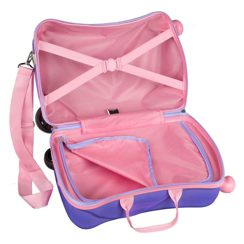 Minnie Mouse Ride-On Trolleykoffer met zitfunctie voor kinderen. De paars met roze koffer is extra stevig en heeft zowel een handvat als schouder-/trekriem. Binnen vind je twee compartimenten, een met elastiek en een met afsluitbare rits. Maximaal aanbevolen draagvermogen: 50 kg. Afmetingen: 47,5 x 32 x 23 centimeter.