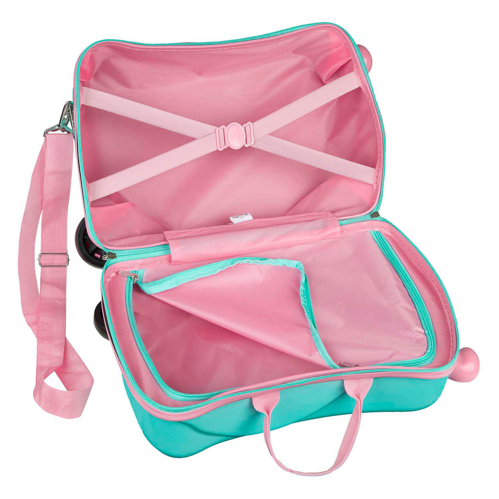 Peppa Pig Ride-On Trolleykoffer met zitfunctie voor kinderen. De blauwe koffer is extra stevig en heeft zowel een handvat als schouder-/trekriem. Binnen vind je twee compartimenten, een met elastiek en een met afsluitbare rits. Maximaal aanbevolen draagvermogen: 50 kg. Afmetingen: 41,5 x 21 x 31 centimeter.