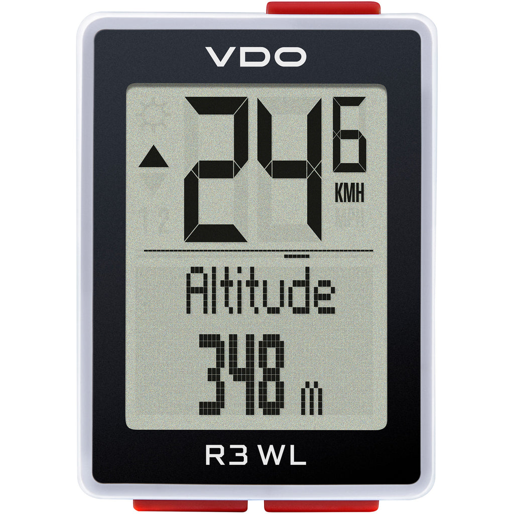 Met deze VDO R3 (digitaal elektronische) draadloze fietscomputer heb je al je gegevens in één oogopslag bij de hand tijdens je mooiste routes in de bergen of heuvels in Zuid-Limburg of de Ardennen. Of het nu op de racefiets, grindfiets of mountainbike is, elke hoogtemeter wordt geteld! De elektrische fietscomputer geeft snelheid, afstand, totale afstand, rijtijd, klok, gemiddelde en maximale snelheid, totale rijtijd, gemiddelde en huidige snelheidsvergelijking en de temperatuur weer. Het verlichte display is goed afleesbaar, zelfs in het donker. Dankzij de geïntegreerde barometrische hoogtemeting wordt de hoogte betrouwbaar weergegeven. Ook kun je 2 wielmaten instellen en dus gemakkelijk wisselen tussen de racefiets en mountainbike. Bovendien kun je jouw totaal van de afgelopen 12 maanden volgen. Het instellen van de wielomtrek is zeer eenvoudig door de voor gemaakte wielmaten. Met de meegeleverde kabelbinders kan de waterdichte fietscomputer snel op het stuur worden gemonteerd en ter bescherming tegen diefstal eenvoudig worden uitgesloten en opgeborgen. De geïntegreerde knoopcel (CR2450) is voldoende om de computer ruim twee jaar van stroom te voorzien. Door de R3 WL te koppelen met een optioneel verkrijgbare trapfrequentiezender (art.nr. 64942), kun je ook de trapfrequentie meten.
