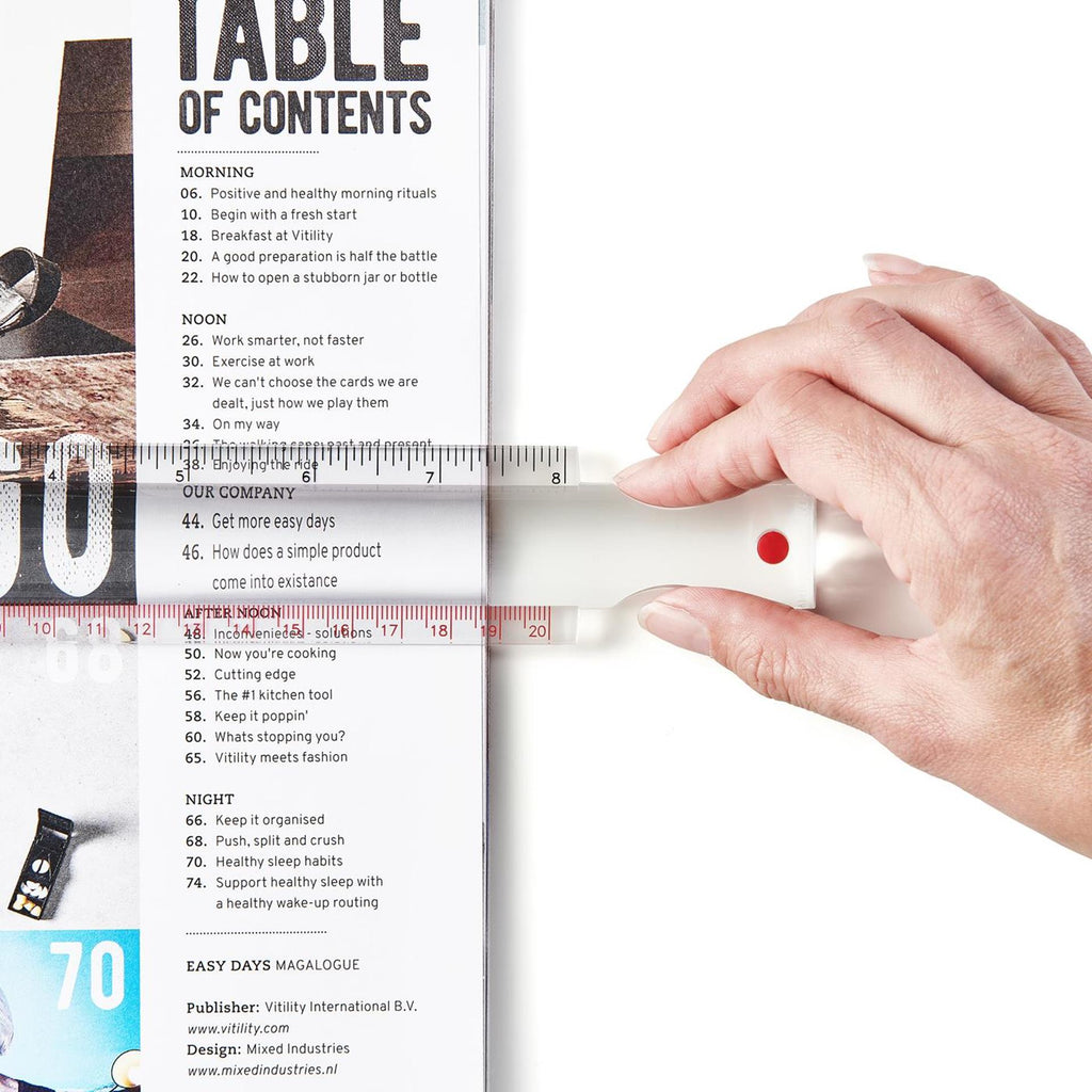 . Een multifunctionele liniaal die krachtig als liniaal van 20cm en als loep. Je vergroot gelijktijdig diverse teksten en kunt ze zo gemakkelijker eten. Met een ergonomisch handvat aan de regelaar. Handig mee te nemen.