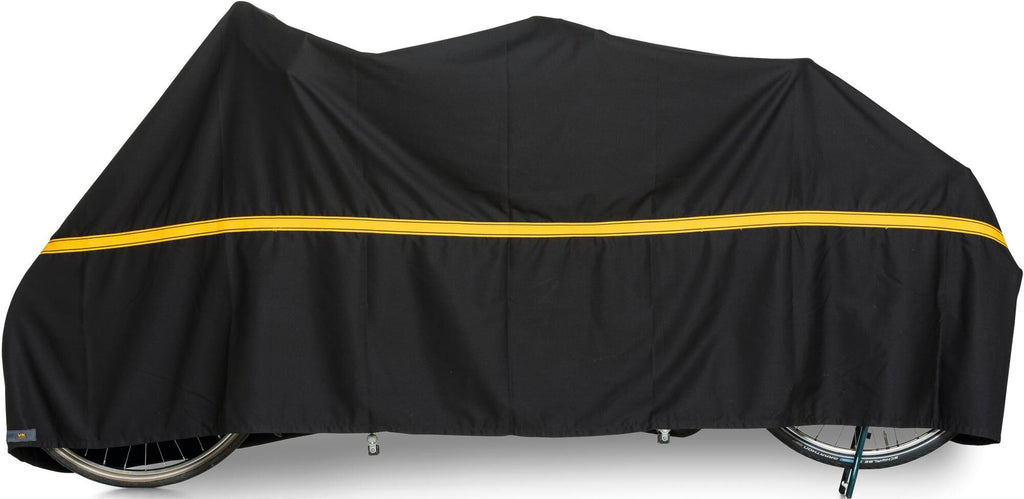 VK fietshoes Tandem de Luxe Deze fietshoes geeft in de winter bescherming tegen ijs, vuil en sneeuw en in de zomer tegen de hitte, stof en harsvlekken. De beschermhoes is geschikt voor één tandem. Specificaties: Kleur: zwart Materiaal: polyetheen Hoogte: 120 cm Breedte: 300 cm UV-Coating: Ja
