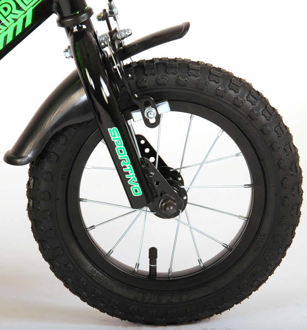 Specificaties van deze Volare Sportivo Kinderfiets - Jongens - 12 inch - Neon Groen Zwart - Twee Handremmen - 95% afgemonteerd