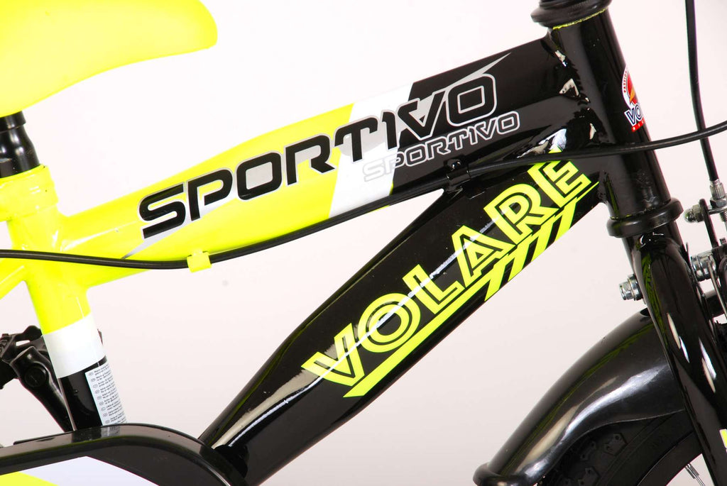 Specificaties van deze Volare Sportivo Kinderfiets - Jongens - 14 inch - Neon Geel Zwart - Twee Handremmen - 95% afgemonteerd