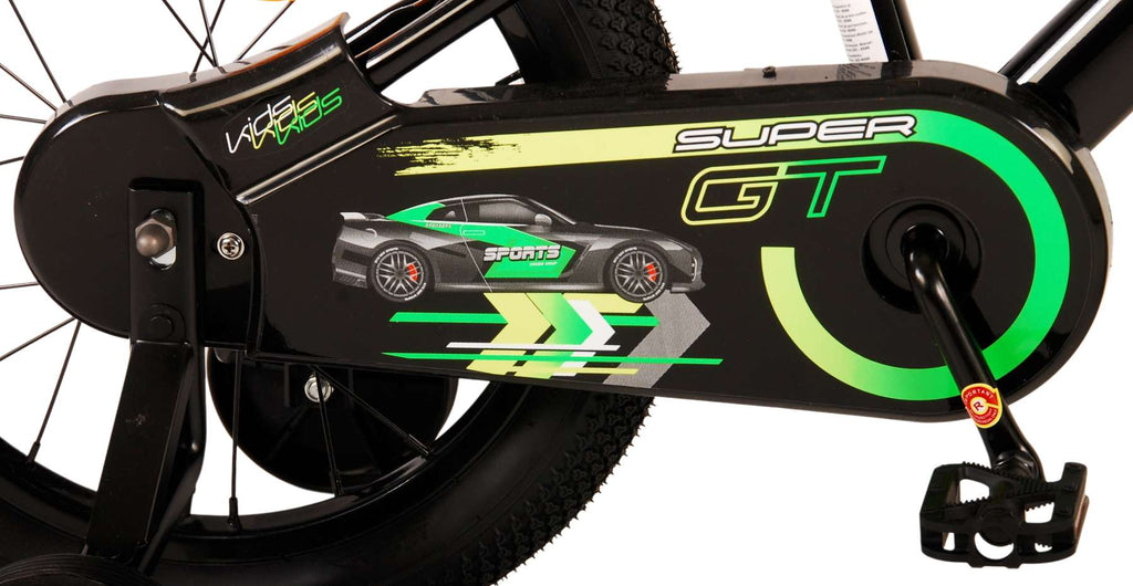 De Volare Super GT 16 inch kinderfiets maakt fietsen leren een feestje! Deze fiets is ontworpen met veiligheid als prioriteit. Hij heeft een handrem en terugtraprem, een gesloten kettingkast en afneembare zijwieltjes. Daarnaast is de fiets voorzien van reflectoren in de wielen, voor- en achterop de fiets en een leuke bel. Het zadel en stuur zijn in hoogte verstelbaar voor optimaal comfort. Met zijn tijdloze design en unieke frame kan deze zwarte fiets met groene accenten wel tegen een stootje. Montagemateriaal is opgenomen om de fiets eenvoudig in elkaar te zetten.