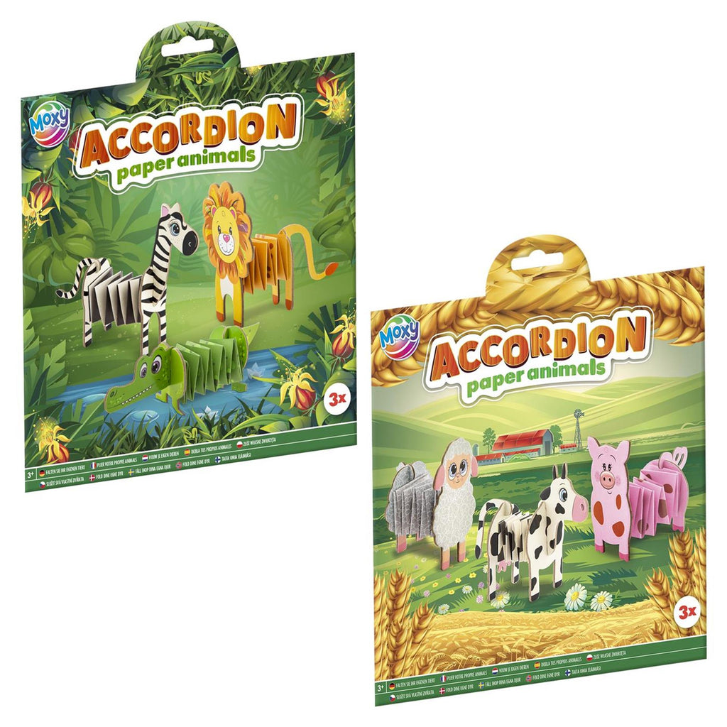 Knutselsetje voor het maken van grappige accordeondieren. Met dit setje maak je 3 jungledieren (zebra, leeuw en krokodil) of 3 boerderijdieren (schaap, koe en varken). Geschikt voor kinderen vanaf 3 jaar.