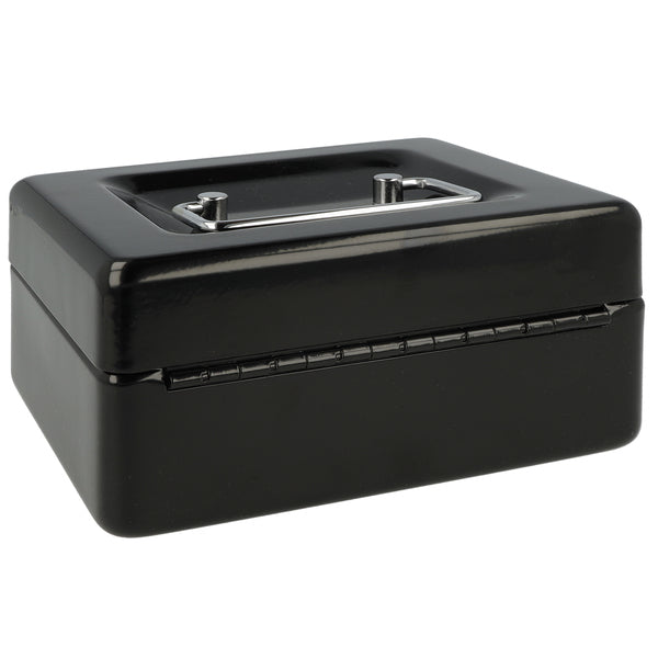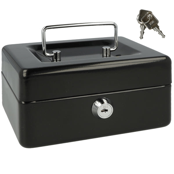 Met deze geldkist bergt u uw geld of waardevolle spullen veilig op. Deze geldkist gemaakt van staal wordt geleverd met 2 sleutels en heeft een kunststof inzet met 6 vakken voor munten. Doordat de geldkist een hangreep heeft die in de deksel valt kunt u de kist gemakkelijk opbergen. Afmeting: 152x120x79mm. Kleur: zwart.